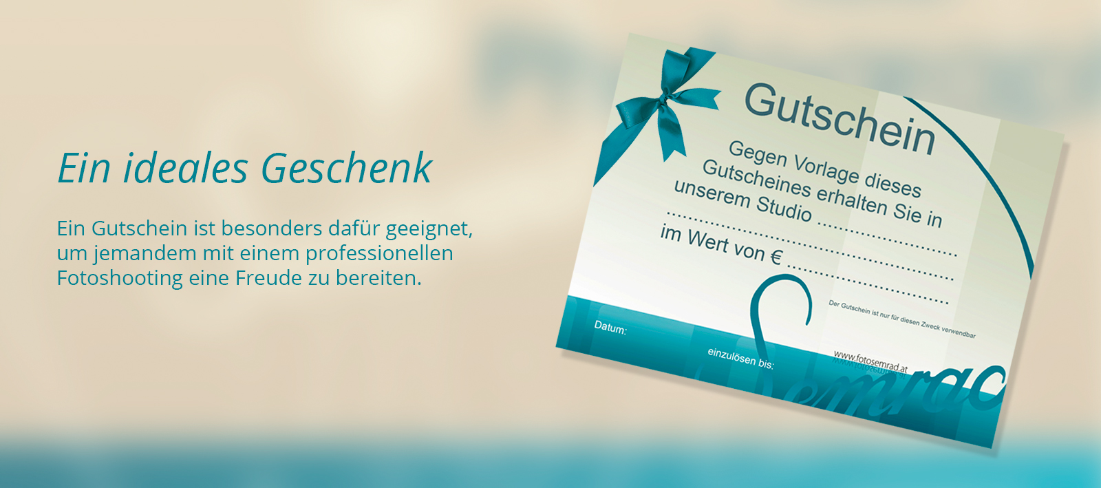 Sie haben die Möglichkeit einen Gutschein in einem bestimmten Wert, oder für ein Fotoserie Ihrer Wahl zu erhalten. Diese sind ausschließlich bei uns im Fotostudio Semrad erhältlich und können nicht über unsere Website erworben werden.